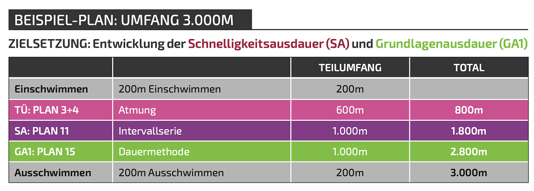 Die Konzentration auf einen einteiligen Hauptteil empfiehlt sich bei Gesamtumfängen bis ca. 2.500m. Halten Sie sich in diesem Fall nur an einen Trainingsschwerpunkt oder absolvieren Sie ein kurzes intensives Schnelligkeits- oder Schnelligkeitsausdauertraining, kombiniert mit einem abschließenden Trainingsteil im Bereich der Grundlagenausdauer.