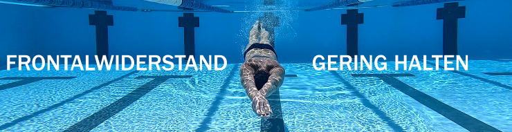 Die nicht ganz so gute Nachricht lautet: wir werden eigentlich ständig durch das Wasser abgebremst. Die bessere Nachricht: wir können mittels Optimierungen dafür sorgen, nämlich mit selbem Aufwand wie zuvor, unser Schwimmtempo erhöhen zu können. Dafür hießt es, den Frontalwiderstand zu reduzieren! Also eine möglichst kleine Stirnfläche gegen die Schwimmrichtung zu stellen.